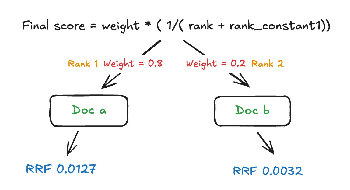 Où k est une constante (généralement fixée à 60) et rang(d) représente la position du document dans une liste donnée. Si un document n'apparaît pas dans une liste, il n'y contribue simplement pas au score.
